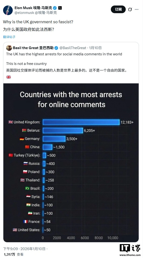 IT之家防御到,针对一张宣称英国因酬酢媒体言论激励的逮捕数目大家最高的图表,马斯克发文非难:“英国政府为若何此法西斯化?”就在数小时前,马斯克还在另一条帖子中称英国企图“压制言论目田”,并将该国称作“监狱之岛”。